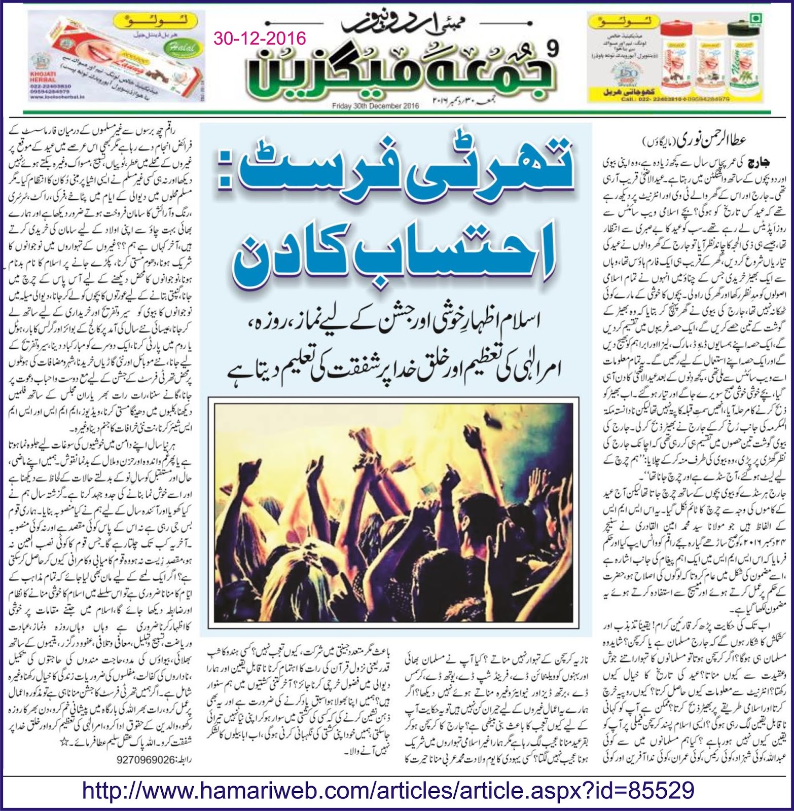 مذہب اسلام اظہارِ خوشی اورجشن کے لیے نماز،روزہ،امرالٰہی کی تعظیم اور خلق خداپر شفقت کی تعلیم دیتاہے۔