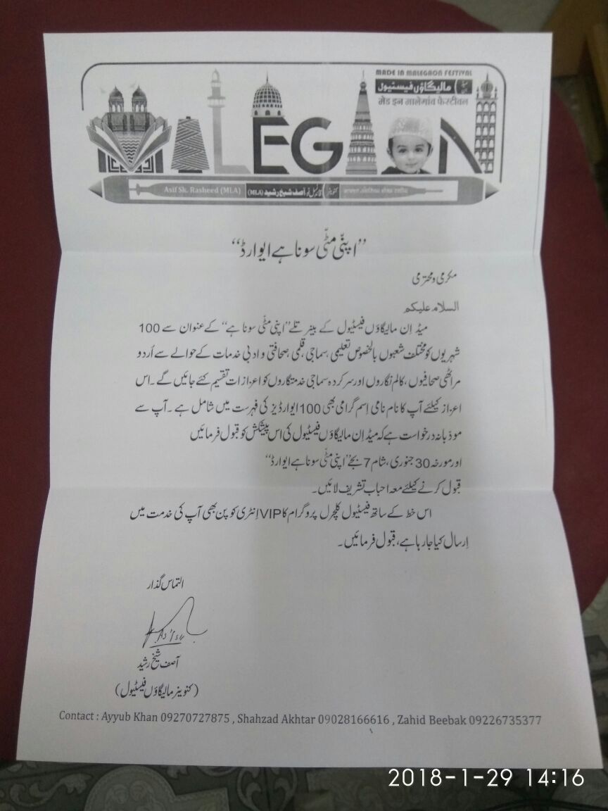 26جنوری تا 30جنوری 2018ءکوریلائبل میدان،درے گاﺅں(مالیگاﺅں)میں ”مالیگاﺅں فیسٹیول“ کا انعقاد عمل میں آیا۔مالیگاﺅں فیسٹیول کے کنوینر آصف شیخ رشید صاحب( ایم ایل اے) اور مالیگاﺅں فیسٹیول کمیٹی نے اس کلچرل پروگرام میں مقامی مصنوعات کی نمائش وفروخت کے ساتھ حمد ونعت،ٹیلنٹ شو، کوئیز کمپیٹیشن، فوڈ فیسٹ، تعلیمی سیمینار، شامِ غزل، ممکری ونقالی،ڈرامہ، آرٹ گیلری، ون منٹ شو، کلچرل پروگرام ،مالیگ ایوارڈ اور اپنی مٹی سونا ہے ایوارڈ فنکشن کا انعقاد کیا جس نے ہر اعتبار سے شہر میں اپنی تاریخ رقم کی۔شہر مالیگاﺅں کے معزز صحافی عطاءالرحمن نوری (M.A.,B.Ed,MH-SET,PET & Journalism)کو ان کی دینی،ادبی اور صحافتی خدمات کے صلے میں مالیگاﺅں فیسٹیول کمیٹی نے ”اپنی مٹی سونا ہے ایوارڈ“سے نوازا۔عطاءالرحمن نوری نے صحافتی کورس میں ریاستی سطح پر اول اور ملکی سطح پر چوتھا مقام حاصل کیا تھاتب سے موصوف تحریر وقلم سے اپنا رشتہ استوار کیے ہوئے ہیں۔موصوف کے اب تک بارہ سو سے زائد مضامین ومقالات ملک وبیرون ملک کے رسائل ،جرائد اور اخبارات میں شائع ہو چکے ہیںاور نو(۹)کتابیں منظر عام پر آچکی ہیںاور عنقریب معروضی امتحانات کے حوالے سے تین ضخیم کتابیں شائع ہونے والی ہیں۔نوری اکیڈمی یوٹیوب چینل پرموصوف کے تعلیمی لیکچرز بھی اپلوڈ ہوتے ہیں۔صحافتی وتعلیمی خدمات اور ڈیجیٹل نالج کی اشاعت پرعطاءالرحمن نوری کو ”اپنی مٹی سونا ہے ایوارڈ“سے نوازا گیا۔چوں کہ ان دنوں موصوف سفر عمرہ پر تھے اس لیے 7فروری بروز بدھ 2018ءکو محترم شہزاد اختر(میدان صحافت)اور محترم جنید صاحب (جنتا جواب)کے ہاتھوں میدان صحافت کی آفس پر موصوف کو قلم، ایوارڈاورمیڈل سے نوازا گیا۔اس اعزاز پر عطاءالرحمن نوری کو تمام خویش واقارب،دوست واحباب،دینی،تعلیمی،سیاسی،سماجی اور شہر کے سرکردہ افراد مبارکباد پیش کرتے ہیںاور عالی جناب شیخ آصف صاحب کو بھی مبارکباد پیش کرتے ہیں کہ انہوں نے اور ان کی ٹیم نے منفرد طرز کا انوکھا اور تاریخی پروگرام کا انعقاد کیا۔