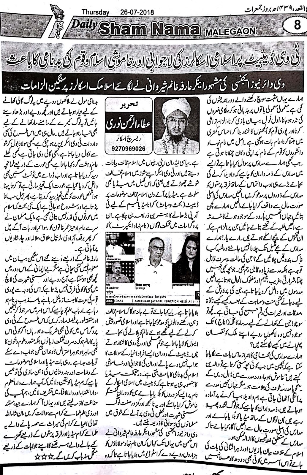 عارفہ خانم کے ذریعے دیئے گئے اس سنگین بیان میں معلوم نہیں کتنی سچائی ہے مگر بے ایمانی کے اس دور میں کچھ بھی ہوسکتا ہے،آج روپے اور سستی شہرت کی لالچ میں کسی کو کوئی فرق نہیں پڑتا ہے کہ اس کی وجہ سے پوری قوم کی عزت کا جنازہ نکل رہاہے یا مذہب بدنام ہو رہاہے۔اربابِ علم کو چاہیے کہ اس امرمیں سرجوڑ کر بیٹھیں اور متفقہ طور پر فیصلہ صادر کریں کہ اس طرح کے ٹی وی پروگرامس میں کوئی بھی شریک نہ ہو۔ہاں اگر کوئی اس پایہ کا عالم ہو کہ نہ صرف مختلف زبانوں بلکہ متعدد علوم وفنون کا بھی ماہر ہو جو ہر اعتراض کا دندان شکن جواب دے سکے تو بات جدا ہے۔رہی بات میڈیا اور اسلامی موضوعات کے وضاحت اور ہندوستانیوں کی ذہن سازی کی تو ہمیں چاہیے کہ ہم میڈیاکویقین دلائےں کہ آپ ہمارے دارالعلوم ، دارالقضاءاور دارالافتاءمیں تشریف لائیں،ہم آپ کی حفاظت کا ذمہ لیتے ہیںاور یہاں آکر ہمارے جید،مستند اور ذی علم علمائے کرام سے سوالات کریں،ان شاءاللہ تعالیٰ انبیائے کرام کی میراث سے حصہ پانے والے یہ علمائے کرام میڈیااور فرقہ پرستوںکے ذریعے کھڑے کیے جانے والے ہر فتنے کا اپنے جوابات کے ذریعے مکمل سدّباب کریں گے۔