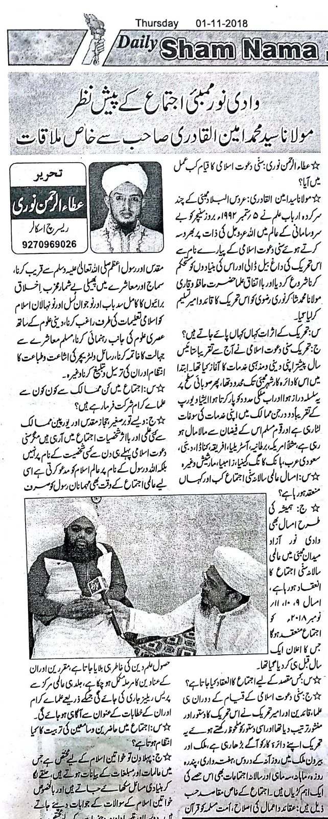٭س:آپ کی جانب سے قارئین کے لیے کوئی پیغام ؟٭ج:اس انٹرویو کے ذریعے میں یہی کہنا چاہوں گا کہ یہ اجتماع صرف تحریک سنّی دعوت اسلامی کا نہیں ہے بلکہ یہ عالم اسلام کا اجتماع ہے ،دی رائیل اسلامک اسٹرا ٹیجک اسٹڈی سینٹر کے مطابق یہ ہندوستان کا سب سے بڑا دعوتی وتربیتی اجتماع ہے ،اس لیے میں ہر خاص و عام سے اپیل کرتا ہوں کہ اپنے قیمتی اوقات سے دو دن کا وقت نکال کر اجتماع میں ضرور شرکت کریں۔