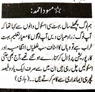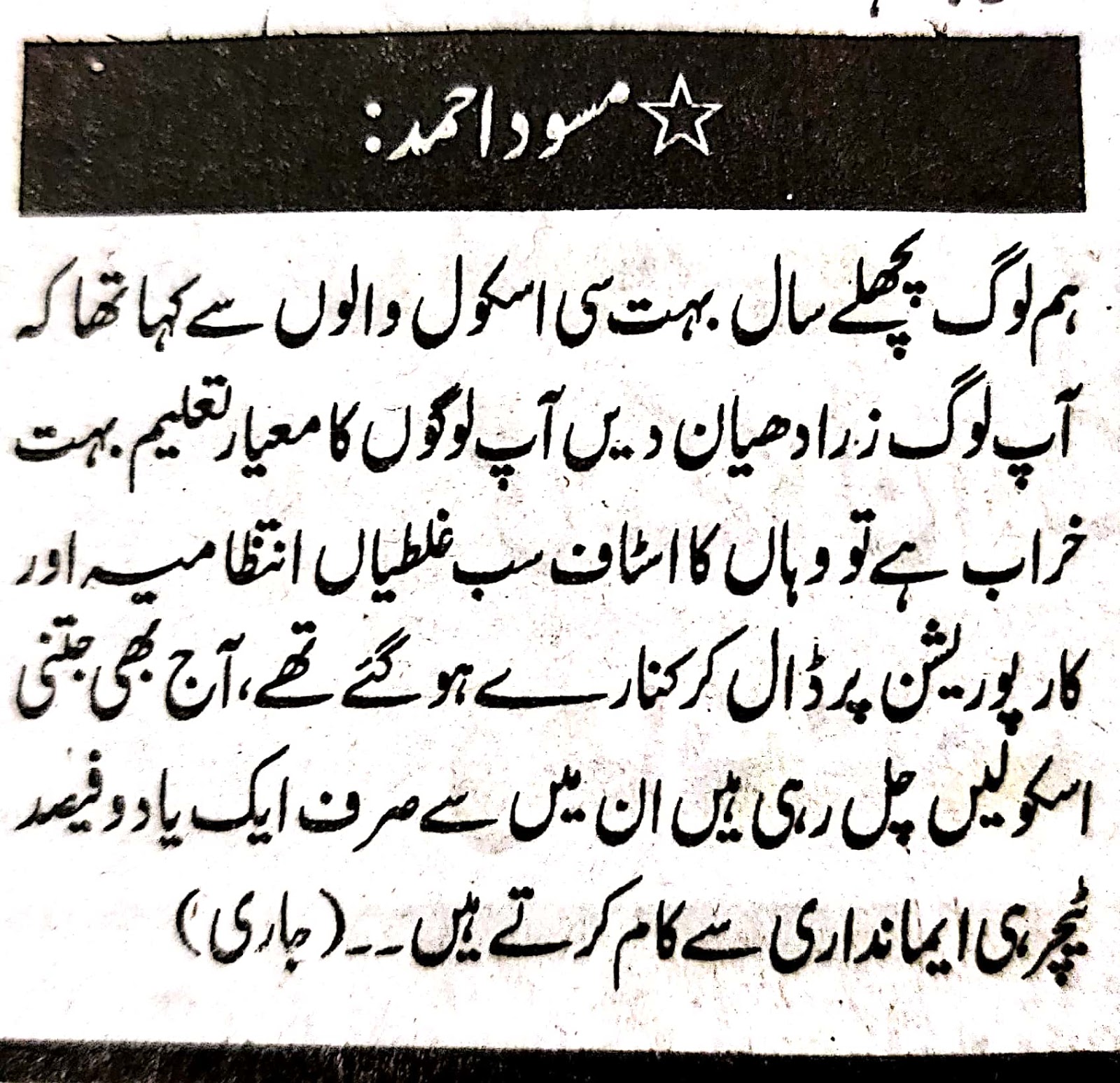 ہم لوگ پچھلے سال بہت سی اسکول والوں سے کہا تھا کہ آپ لوگ زرا دھیان دیں آپ لوگوں کا معیار تعلیم بہت خراب ہے تو وہاں کا اسٹاف سب غلطیاں انتظامیہ اور کارپوریشن پر ڈال کر کنارے ہو گئے تھے ،آج بھی جتنی اسکولیں چل رہی ہیں ان میں سے صرف ایک یا دو فیصد ٹیچر ہی ایمانداری سے کام کرتے ہیں۔(جاری)