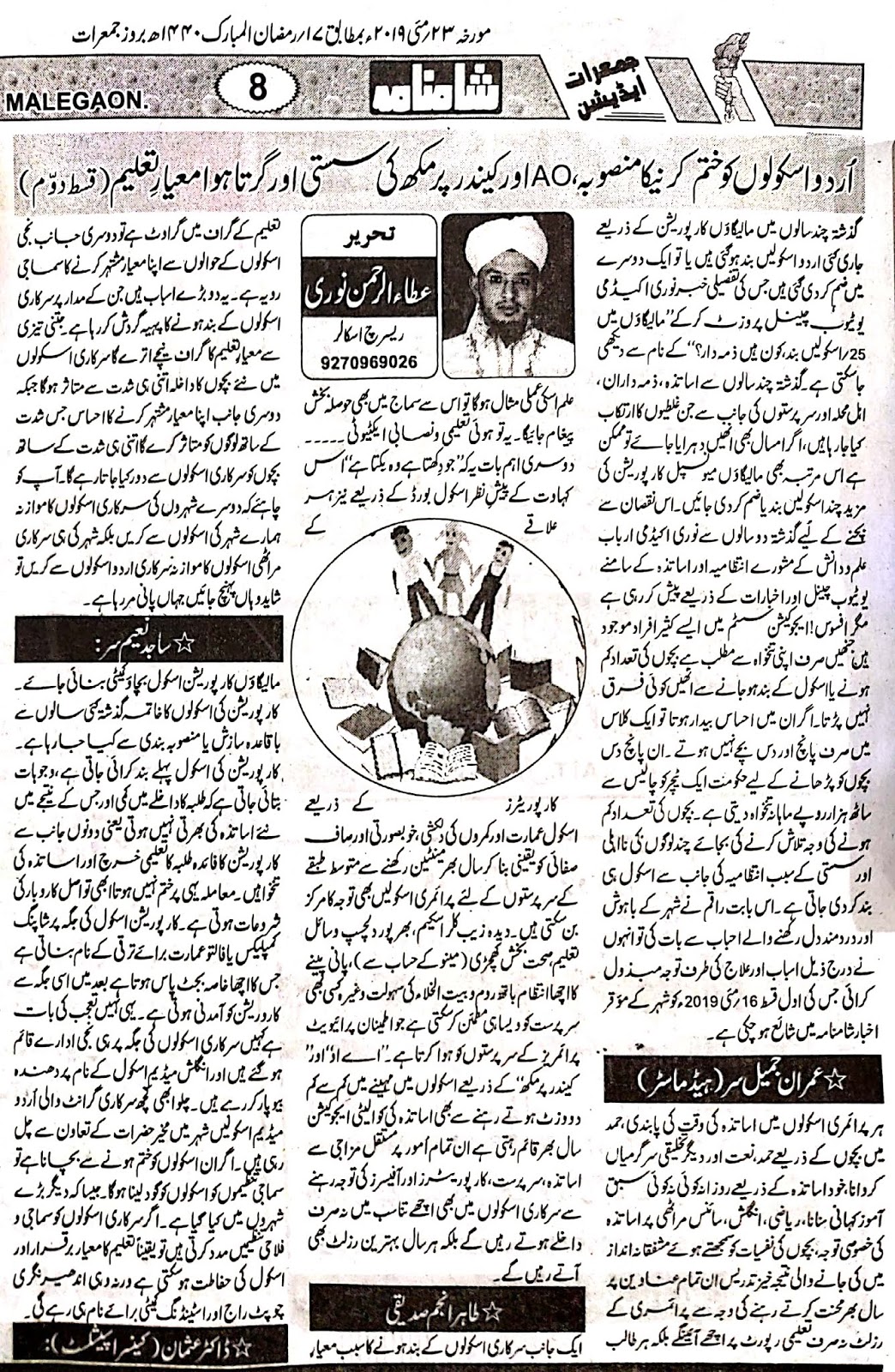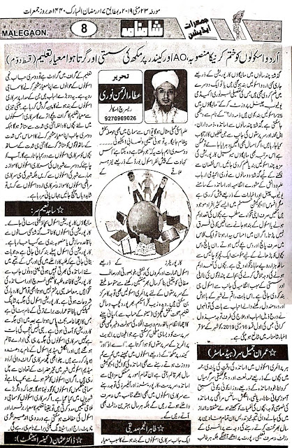 گذشتہ چند سالوں میں مالیگاﺅں کارپوریشن کے ذریعے جاری کئی اردو اسکولیں بند ہو گئی ہیں یا تو ایک دوسرے میں ضم کر دی گئی ہیںجس کی تفصیلی خبر نوری اکیڈمی یوٹیوب چینل پر وزٹ کرکے ”مالیگاﺅں میں 25اسکولیں بند، کون ہیں ذمہ دار؟“کے نام سے دیکھی جا سکتی ہے۔ گذشتہ چند سالوں سے اساتذہ ، ذمہ داران ، اہل محلہ اور سرپرستوں کی جانب سے جن غلطیوں کا ارتکاب کیا جا رہا ہیں ، اگر امسال بھی انھیں دہرایا جائے تو ممکن ہے اس مرتبہ بھی مالیگاﺅں میونسپل کارپوریشن کی مزیدچند اسکولیں بند یا ضم کر دی جائیں ۔اس نقصان سے بچنے کے لیے گذشتہ دو سالوں سے نوری اکیڈمی ارباب علم ودانش کے مشورے انتظامیہ اور اساتذہ کے سامنے یوٹیوب چینل اور اخبارات کے ذریعے پیش کر رہی ہے مگر افسوس!ایجوکیشن سسٹم میں ایسے کثیرافراد موجود ہیں جنھیں صرف اپنی تنخواہ سے مطلب ہے بچوں کی تعداد کم ہونے یا اسکول کے بند ہو جانے سے انھیں کوئی فرق نہیں پڑتا۔ اگر ان میں احساس بیدار ہوتا تو ایک کلاس میں صرف پانچ اور دس بچے نہیں ہوتے ۔ان پانچ دس بچوں کو پڑھانے کے لیے حکومت ایک ٹیچر کو چالیس سے ساٹھ ہزار روپے ماہانہ تنخواہ دیتی ہے۔ بچوں کی تعدادکم ہونے کی وجہ تلاش کرنے کی بجائے چند لوگوں کی نااہلی اور سستی کے سبب انتظامیہ کی جانب سے اسکول ہی بند کر دی جاتی ہے ۔اس بابت راقم نے شہر کے باہوش اور دردمند دل رکھنے والے احباب سے بات کی تو انہوں نے درج ذیل اسباب اور علاج کی طرف توجہ مبذول کرائی جس کی اول قسط 16مئی 2019ء کو شہر کے